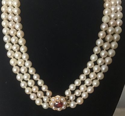 Gorgeous Three Row Cultured Pearl Choker Necklace With Garnet & Pearl Clasp